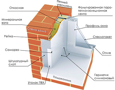 Вот схема утепления откоса с использованием минеральной ваты,