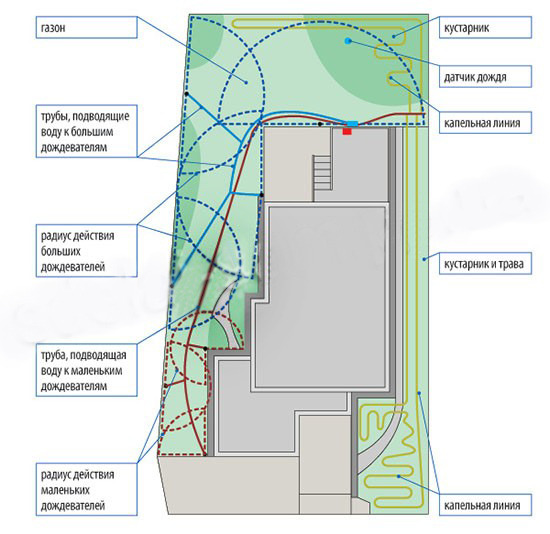 Пожалуй, два основных способа полива - это выдвижные дождеватели и капельная линия. Если говорить о схемах полива, то предлагаю рассмотреть следующую картинку: