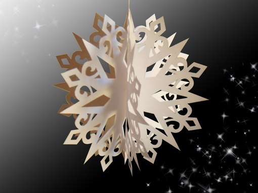 Когда процесс вырезания подобных снежинок будет освоен, можно перейти к более сложному этапу по изготовлению снежинок - это объемные снежинки, которые часто используют для украшения помещения, размещая их подвешенными на люстрах и других предметах.