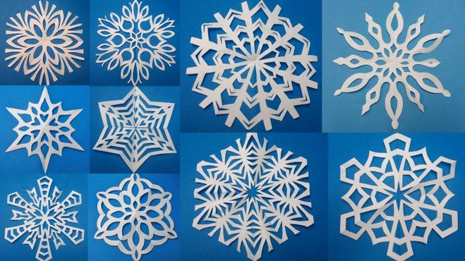Снежинки могут быть самыми разными в зависимости от того, какой шаблон для вырезания на заготовке из бумаги Вы предпочтете.
