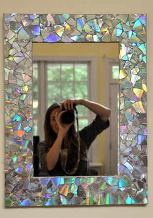 Любите оригинальные рамки для фотографий и картин? Тогда вам точно стоит воспользоваться дисками, которые лежат без дела. Диск надо будет нарезать на кусочки. Но мельчить, конечно, не стоит, иначе их будет сложно приклеивать к поверхности рамки.