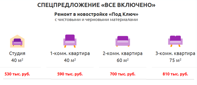 Предлагаю вам посмотреть скриншот с расценками, которые, как мы правильно понимаем, зависят от площади квартиры именно в новостройках: