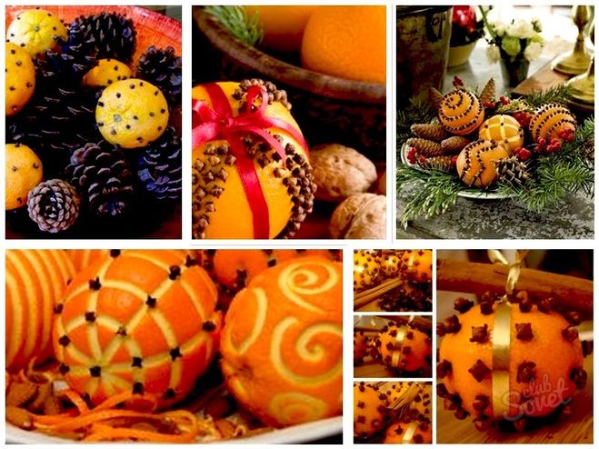 Также и на ветки елки развесить несколько экзотических фруктов, например, физалис или карамболу. Праздничный еловый запах дополнит аромат цитрусовых. Апельсины или лимоны можно украсить гвоздичным узором, очень красивый новогодний декор: