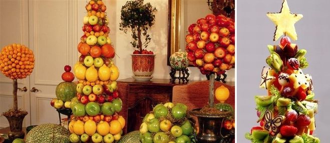Чтобы угодить хозяйке года добавьте в праздничный интерьер комнаты, елки больше сочной листвы и фруктов, обезьянка очень любит их. На видном месте в комнате можно поставить несколько больших ваз с фруктами: бананы, ананасы, виноград, апельсины. Или создать фруктовые пирамиды, елочки.