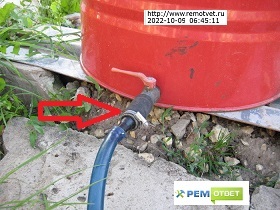 В бочке, или оной емкости делаются отверстия, в верхней части для присоединения шланга, далее ввариваем патрубок, через него бочка будет наполняться водой, второй конец шланга в точке водозабора.