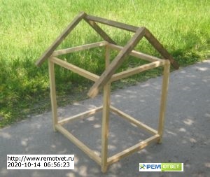 Если будка будет с односкатной кровлей, то передние вертикальные бруски должны быть чуть длинней задних, вот фото