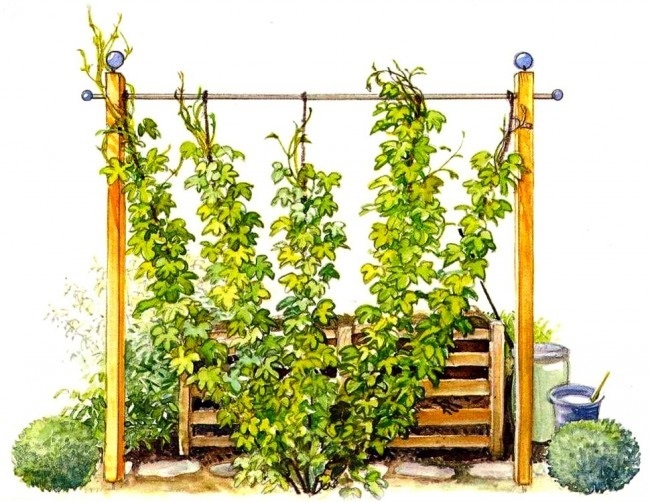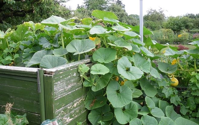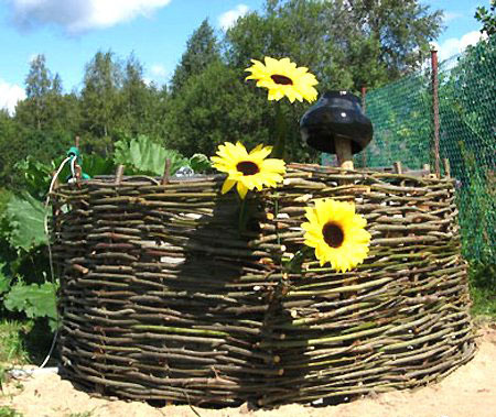 Компостную кучу можно задекорировать, посадив весной на ней рассаду тыквы или вокруг нее посадить цветы или сплести декоративный забор из лозы: