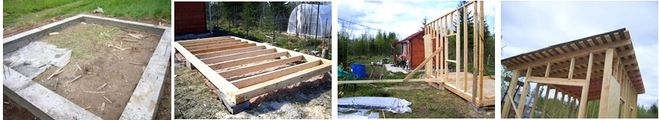 На фундамент делается нижняя обвязка из брусьев, затем установить лаги. Пол из досок (размер 150х30) можно настелить на этом этапе строительства сарая или после, на заключительном этапе, просто на готовом удобней работать, возводить каркас. На нижнюю обвязку закрепить опорные стойки. Вверху они соединяются уже верхней обвязкой из брусьев. Опорные стойки должны установлены не только по углам каркаса, но и в местах проемов дверей и окон сарая.