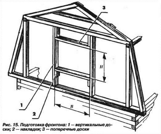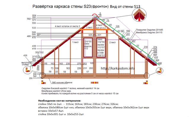 Следует добавить, что монтаж каркасной конструкции фронтона с использованием древесины включает, кроме непосредственно монтажа элементов его конструкции, еще и обшивку фронтона одним из следующих материалов:
