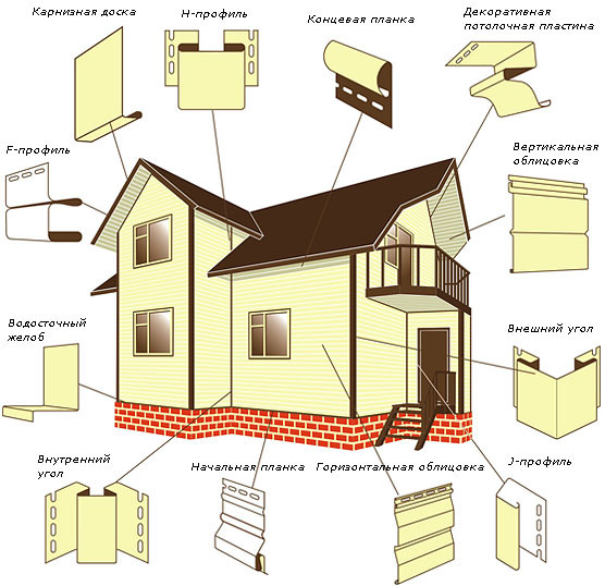 Отделка сайдингом с использованием различных дополнительных элементов представлена на этой схеме