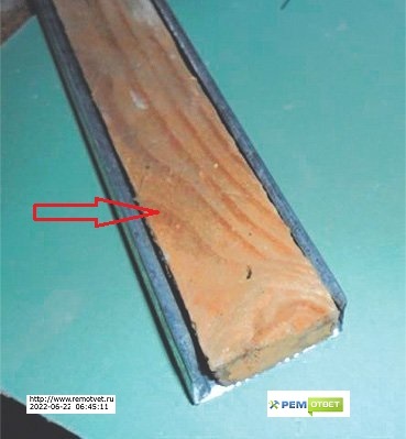 Брусок чуть меньше по размеру внутренней части профиля, закрепить брусок в профиле можно саморезами по дереву, ориентировочный "шаг" между саморезами 200 мм.