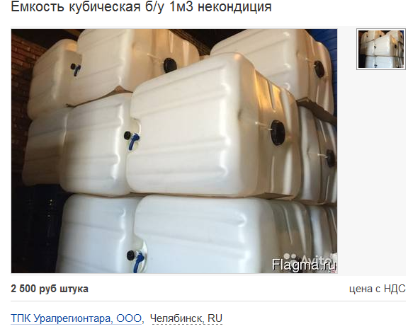 Некондиционные пластиковые ёмкости на 1 куб можно приобрести в "Уралрегионтара", звонить +73517513050, +73517502289 Александру Рящикову или заказать по факсу +73512487696. Предлагают за 2 с половиной тысячи рублей.