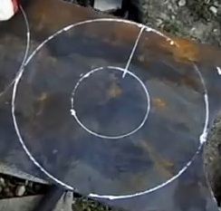 Сначала на листовом металле рисуем окружность диаметром 300мм и внутри ее еще одну - диаметром нашей трубы 108мм: