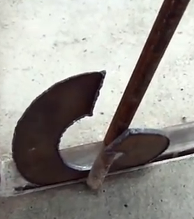 Резаком вырезаем нашу деталь и разрезаем полосу под прямым углом. Зажимаем заготовку в тиски или подходящую для надежной фиксации щель и с помощью лома разгибаем металл и получаем винт: