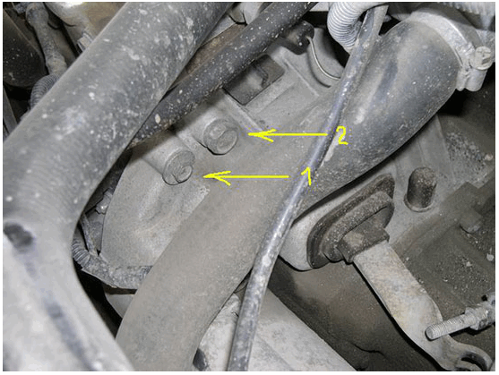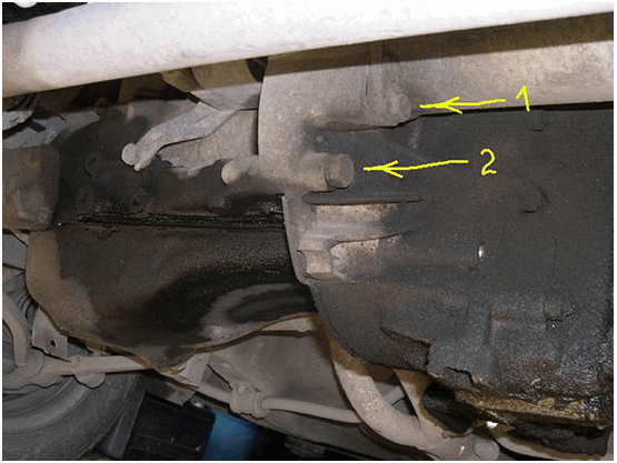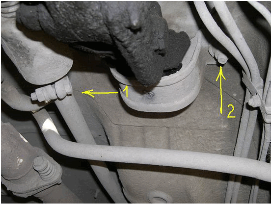 5) Открутив сначала левый болт (1) крепления КПП, можно откручивать правый болт (2) — ни в коем случае не наоборот.