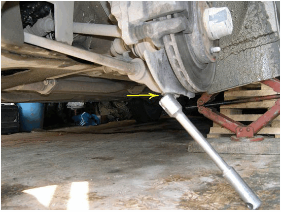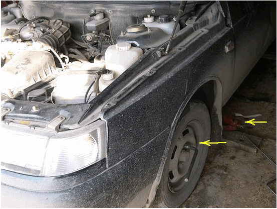 1) Поставив автомобиль на место производства работ и надежно закрепив его от ухода, ослабьте болты крепления левого колеса и, поддомкратив переднюю часть, установите на козлы.