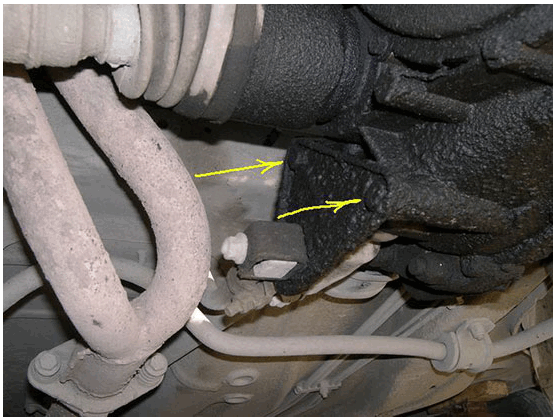 13) Поставив опору под двигатель, чтобы при не порвались шланги отопителя, открутите две гайки крепления подушки.