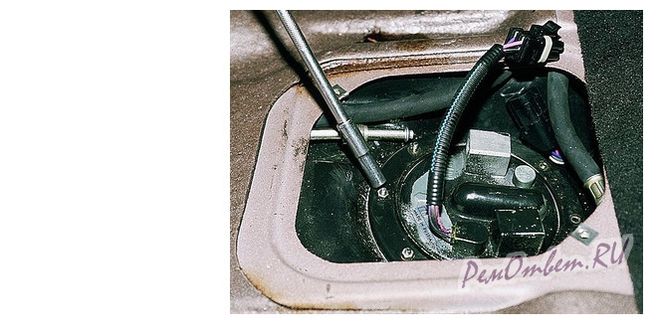 - Переходите в салон автомобиля и снимите заднее сиденье, именно под ним находится топливный насос. К нему подходят электроразъем и две топливных трубки — подающая и сливная.