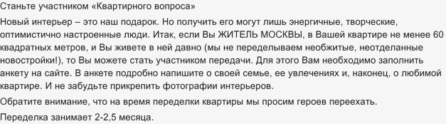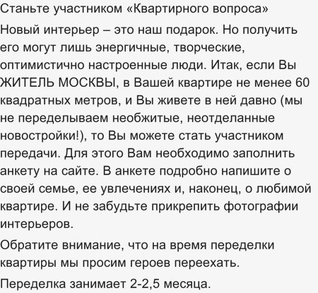 Кроме этого, во вторых - у участника должна быть возможность съехать с квартиры (полностью освободить!) вместе с семьёй на время съёмок, а это 2 - 2.5 месяца.