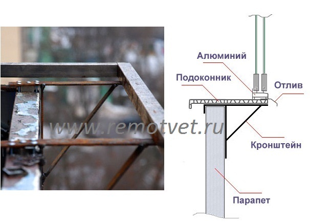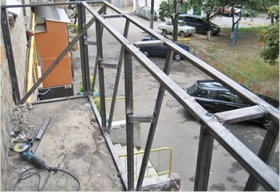 Каркас для выносного балконного окна должен быть металлическим и прочно соединяться с балконом. Потребуются: металлическая полоса шириной 30-40 мм, металлические профили 20х40 мм, уголок 50х50 мм. Сначала выставить по уровню крайние кронштейны, их необходимо приварить к стальному каркасу балконного ограждения, а промежуточные уже подгонять под уголок или профиль. Сверху, для жесткости конструкции, закрепить еще два профиля.