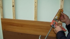 К клею нужен "пистолет", тонким слоем наносим клей по периметру панели, далее, панель прижимаем и чуть надавливаем.