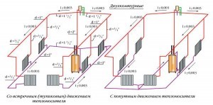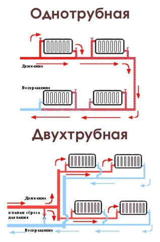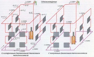 В частном доме может использоваться как однотрубная, так и двухтрубная система разводки. Во втором варианте обогрев будет происходить более рационально и каждый из радиаторов будет одинаково теплым. Однотрубная менее затратная по материалам.
