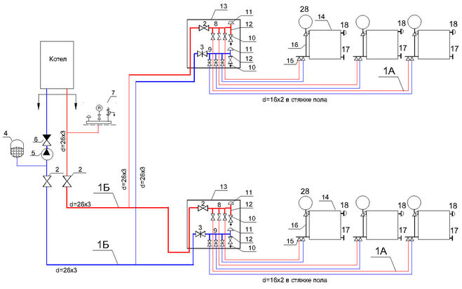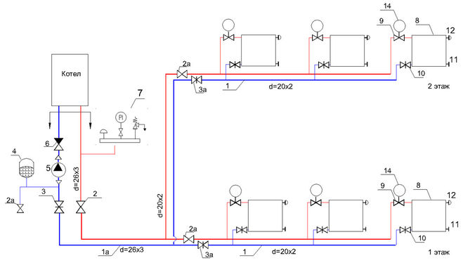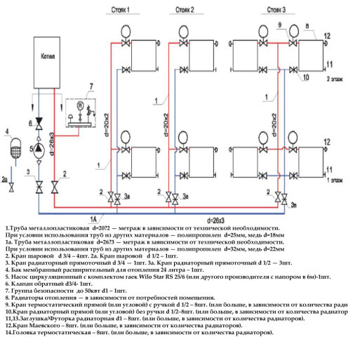 Также разводка труб может быть горизонтальной и коллекторной (лучевой). В случае, если в доме этажей два и более, то может применяться еще и вертикальная. Для эксплуатации более подходящий вариант – лучевая, но она очень затратная на этапе монтажа.