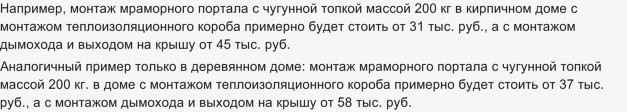 Если рассматривать готовые камины (не выложенные из кирпича), то они представляют собой топку и облицовку (портал). Топку- это готовая капсула. На сегодняшний день различные производители предлагают огромное множество топок, как стальных, так и чугунных, с подъёмным механизмом и с простым распашным открыванием дверцы. Цены на самые недорогие модели начинаются примерно от 45 000 руб. К топке подбирается готовая облицовка, которых тоже огромная масса. Цена зависит от сложности и материалов, из которых она изготовлена. Это может быть и мрамор, и ракушечник, и гранит и агломерат, и металл и дерево. Самые недорогие представляют собой, по-сути, крашеный бетон. Стоимость на них начинается примерно от 30 000 руб. Установка камина включает в себя работы по установке топки, подключение её к дымоходу, сборка и установка облицовки, теплоизоляция, зашивка и отделка каминного короба. С учетом всех понадобившихся материалов(трубы, базальтовая вата, гипсокартон, вент. решетки и пр.) и сложности работ, а также транспортных расходов, стоимость монтажа камина в Омске может варьироваться от 60.000 руб. до 80.000 руб.
