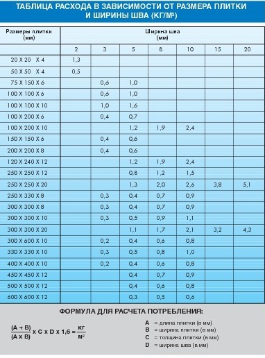 - Математический способ. Количество затирки определяется с помощью таблицы или по формуле:В формуле число 1.6 - средний коэффициент объемного веса готового раствора затирки. Этот коэффициент у разных производителей немного отличается друг от друга.