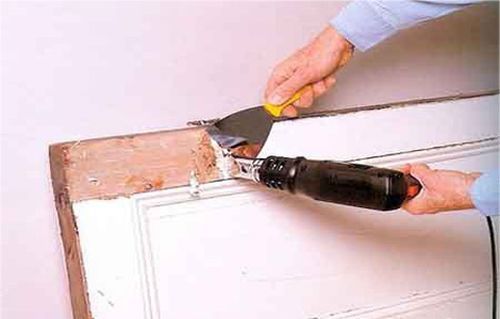 Если краска снялась не полностью (проблема в филёнках) то окончательно её можно снять, или при помощи ручной шлифовальной машины, или термическим методом (фен + шпателя) или химическим (смывки).