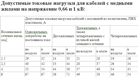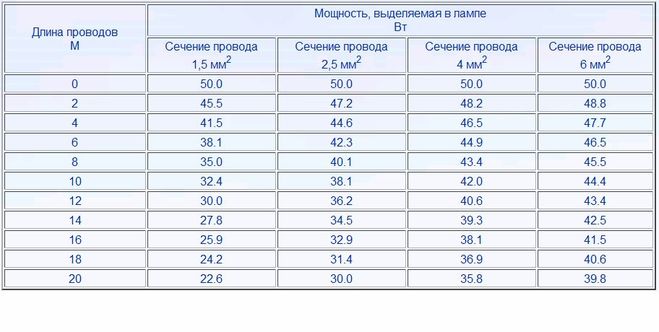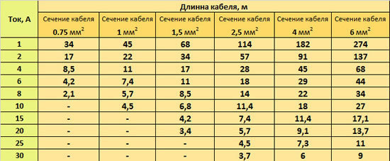Ну а в целом существую таблицы (таблица ниже, с учётом длины провода и его сечение),