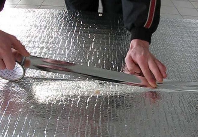 На пол уложите теплоотражающий материал и все стыки проклейте скотчем. Материала должно хватить на всю площадь пола и чем меньше будет стыков, тем лучше.