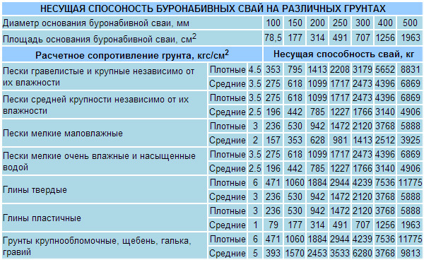 Этой таблицей можно воспользоваться для того, чтобы без особых затруднений найти значение несущей способности свай в зависимости от типа подстилающих грунтов