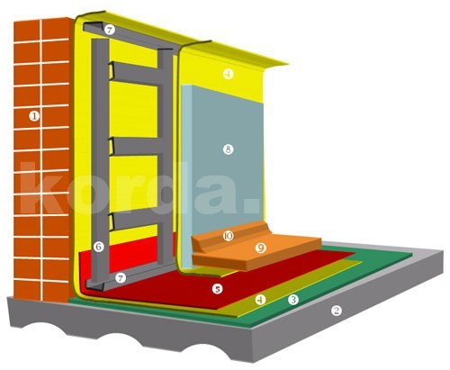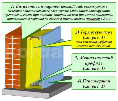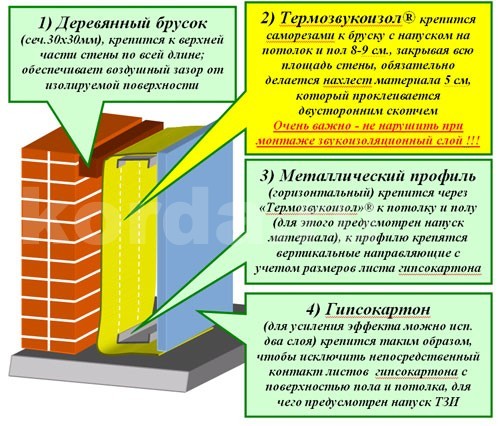 Техника монтажа термозвукоизола немного отличается в зависимости от того, что необходимо изолировать: стены, пол или потолок, однако в любом случае этапность работ хорошо объяснена на примере монтажа термозвукоизола на межкомнатную перегородку на следующей схеме