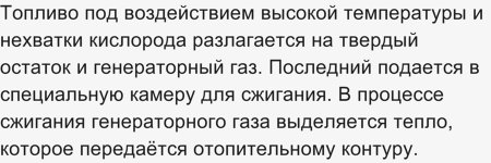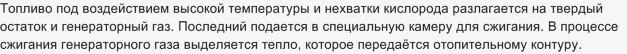 Благодаря пиролизу, в топке котла происходит предварительное подсушивание дров, и подогрев воздуха, подающегося через специальные отверстия в задней части котла и напрявляемого далее к керамической форсунке.