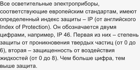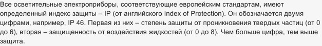 О влагозащищенных светильниках: для помещений с повышенной влажностью, к каким относятся ванные, требуются светильники, со степенью защищенности IP44 или IP54. Маркировка IP "Ingress Protection Rating" - степень защиты корпуса. Первая цифра показывает степень защиты от проникновения пыли. Значение 4 или 5 говорит о том, что корпус защищен от проникновения частиц размером менее 1 мм (4), и пылезащищенные (5). Вторая цифра свидетельствует о защищенности от попадания влаги. Цифра 4 - значит, светильник имеет защиту от брызг в любом направлении.