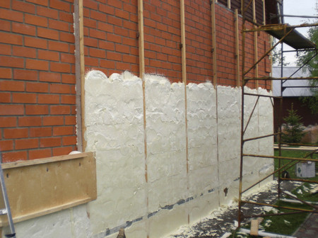 Теплоизоляция стен методом напыления пенополиуритана, представляет из себя нанесение на стену, фасад жидкую фракцию полиола и изоционата.