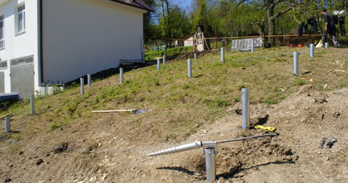 Забивка свай свай не самое правильное решение для укрепления грунта в нижней части участка. Впрочем не видя ситуации трудно судить об этом решении, но думаю для таких целей существуют более дешевые и грамотные подходы нежели забивка свай. Вообще то для таких работ требуется высадка кустарника подойдут такие многолетники, как кедр, сосна, снежеягодник, боярышник, хеномелес, сирень, шиповник, ежевика, рябинник, айва, облепиха, уксусное дерево, дейция, древовидный пион.