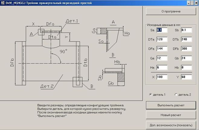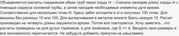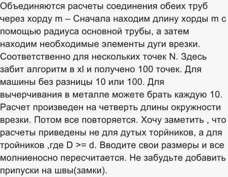 Требуемые вычисления чрезвычайно сложны и включают элементы специальных дисциплин. Поэтому непрофессионалу с вычислениями самостоятельно не справиться. Однако есть возможность воспользоваться для расчетов уже разработанными пособиями. В интернете размещена готовая таблица, с помощью которой вычисления и заготовка лекала выполняются моментально. Правда, использование таблицы не бесплатное, но, думаю, что она того стоит. Для расчета необходимо в клетки, окрашенные желтым цветом, ввести значение диаметров трубы и вертикального патрубка. В результате получаются координаты точек абсциссы и ординаты. Полученные значения переносятся на картон или паронит и соединяются.