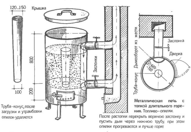 Это самая простейшая схема печи работающей на опилках долгого горения. Можно усложнить конструкцию печи об этом можно посмотреть вот здесь: