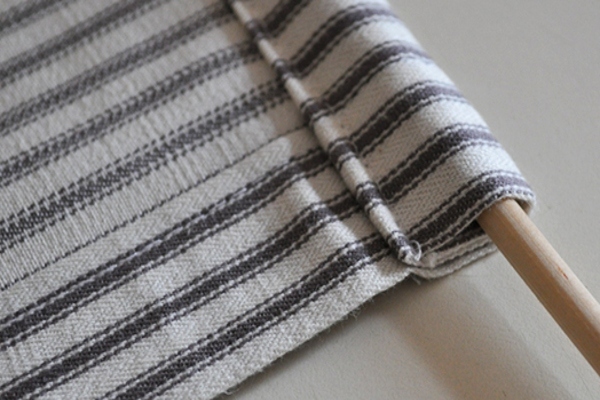Далее следует закрепить на планку держатель. Здесь вариантов может быть несколько. Если планка из дерева, то можно воспользоваться степлером и скобами. Если металлическая, то обвернуть материал вокруг нее и прострочить. Как вариант, вшить молнию – это облегчит снимание и надевания шторы для стирки.