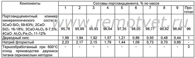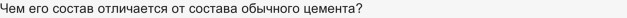 В составе его основным минералом, 70-80% от общего состава, является силикат кальция (клинкерный минерал). Также в состав входит, для быстрого схватывания, гипс (CaSO4∙2H2O), до 3,5% и активные минеральные добавки до 15 %.