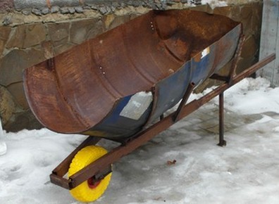 Более дешевый вариант тачки можно сделать ,если кузов будет ,из разрезанной вдоль,металлической ,старой бочки.Только, под эту конструкцию кузова ,нужно, для усиления жесткости,приварить дуги,чтобы бочка не потеряла форму.