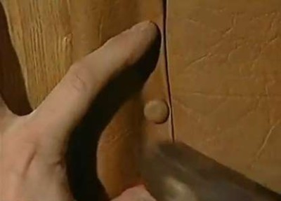 Сначала выбрать рисунок, узор для декоративной обивки. Забить на деревянном полотне обычные гвоздики в тех местах, где будут крепиться декоративные обивочные гвозди, согласно рисунку, но не до конца, где-то 1см оставить над поверхностью. Когда приклеите поролон и дерматин, то гвоздики продавите через материал и на обивке останутся места, видные для забивания новых декоративных гвоздиков. Рисунок красиво смотрится, если слой утеплителя достаточно пышный.