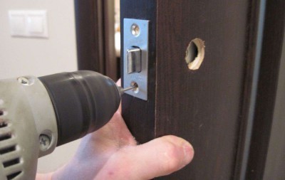 Утеплитель закреплен, дерматин равномерно натянут и тоже закреплен по периметру на клей. Поставлены на место замок и дверная ручка, продавлены гвоздики через утеплитель и дерматин и вытащены из полотна. Затем нарезать из обивочного материала полосы-растяжки шириной 3 см, количество зависит от выбранного рисунка. Эти растяжки, в виде тесьмы, от гвоздя к гвоздю и будут создавать узор.