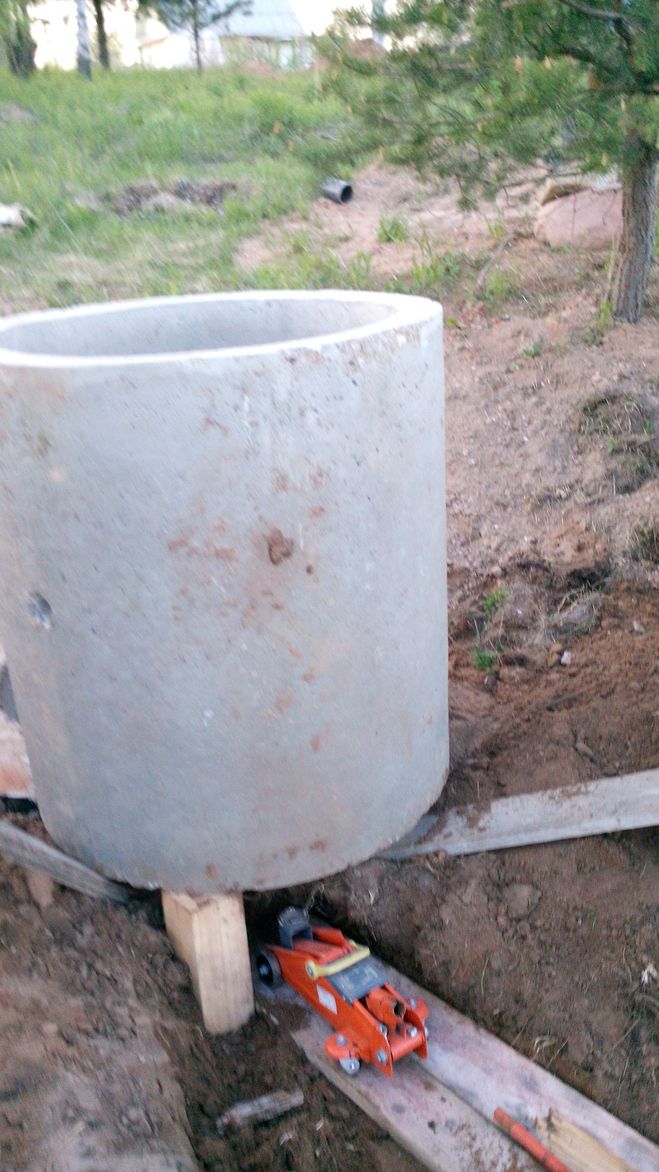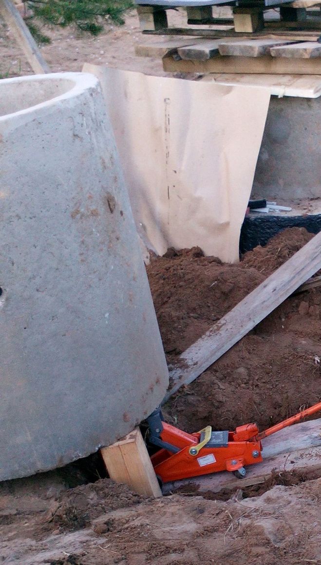Колодезное кольцо диаметром 0,7м и высотой 0,9 м я установил самостоятельно при помощи автомобильного домкрата 1,5 тонн и нескольких досок. Домкратом я его приподнимал, а досками перемещал в сторону, используя их как рычаг, на возведение кольца ушло полчаса и ни капли пота.