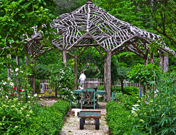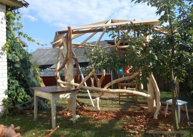 Часто на участве удаляются аварийные деревья, которые нужно убрать с участка или деревья, которые затеняют сад. Из них можно соорудить необычную беседку или перголу, хотя это одно и тоже, только беседка с крышей, а стропильная система перголы может быть открытого типа без кровли.