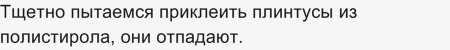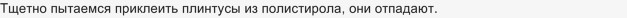 Клей наносится на плинтус, в районе его прилегания к потолку и к стене, наносится точечно.