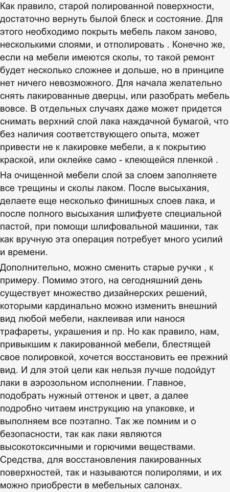 Специальные полироли и средства для восстановления поверхностей лакированной мебели, в ассортименте продаются в магазинах и мебельных салонах. Так же хороши и удобны при правильном применении аэрозольные лаки.