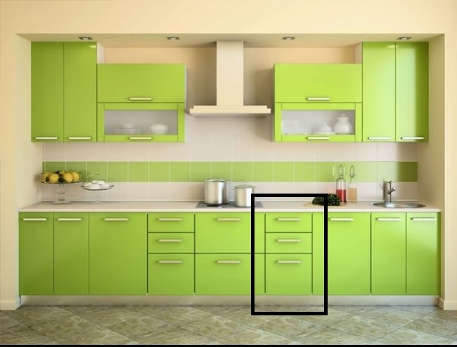 Обратите внимание на фото выше, черным квадратом я отметила какой ящик не совсем удобен. Это два маленьких как под ложки и вилки, один большой под кастрюли. Особенно если этот ящик 60 см шириной. В нижний ящик ставятся тяжелые кастрюли и открывание делается не очень удобным. Лучше вот такие ставить: